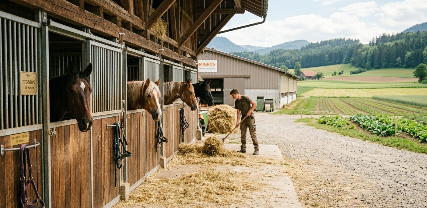 Wir sind ein Familienbetrieb mit Pferdepension (10 Boxen), Ackerbau (Getreide, Zuckerrüben, Kartoffeln und Zwiebeln), Hühnermast (Migros) und kleinem Gemüseanbau (Salat, Spargeln, Rosenkohl, Zucchetti etc.) für die Direktvermarktung auf dem Markt in La Chaux-de-Fonds.