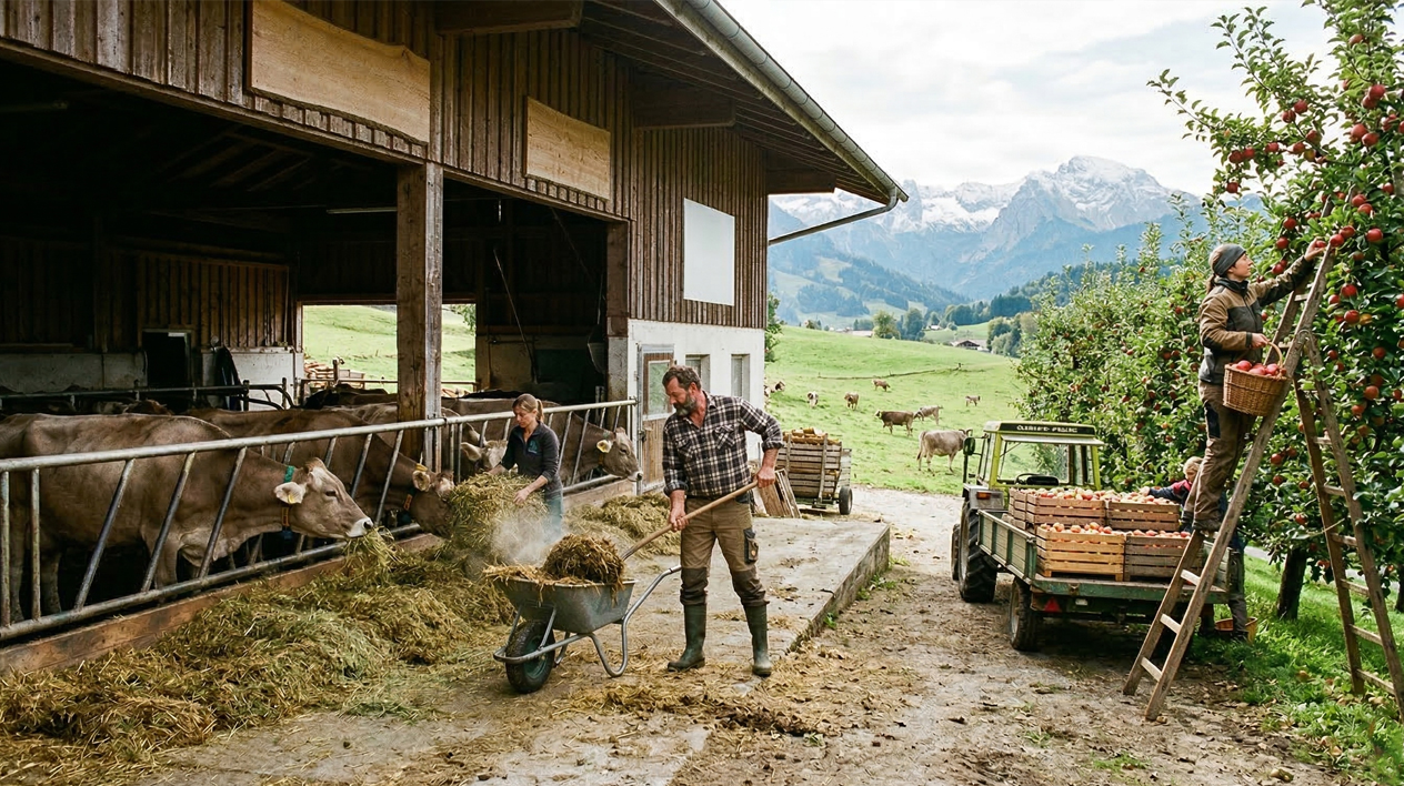 diverse Arbeiten in den Bereichen Landwirtschaft, Milchwirtschaft und Obstbau (Äpfel pflücken, Kühe füttern und misten, etc.)