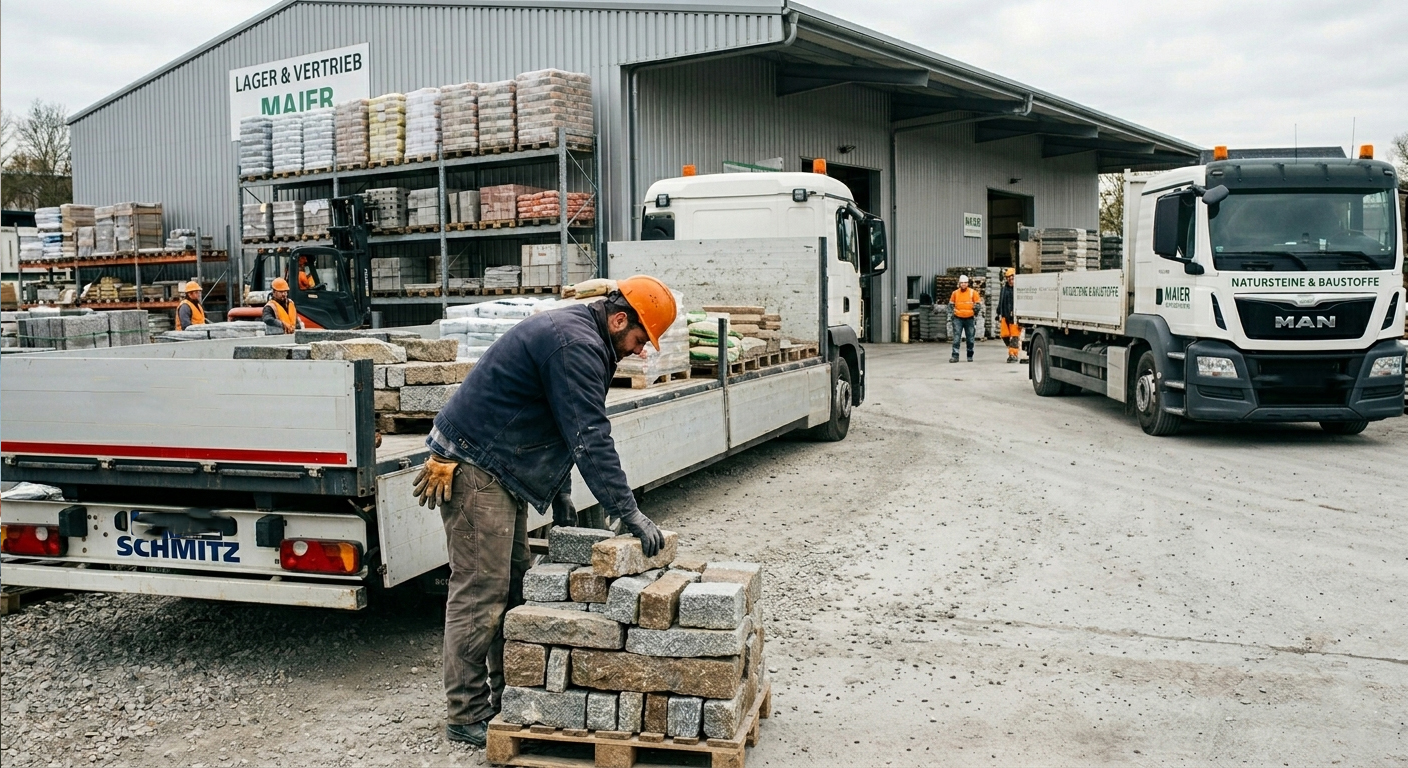 Be- und Entladen von Anhängern mit Natursteinen und Baustoffen