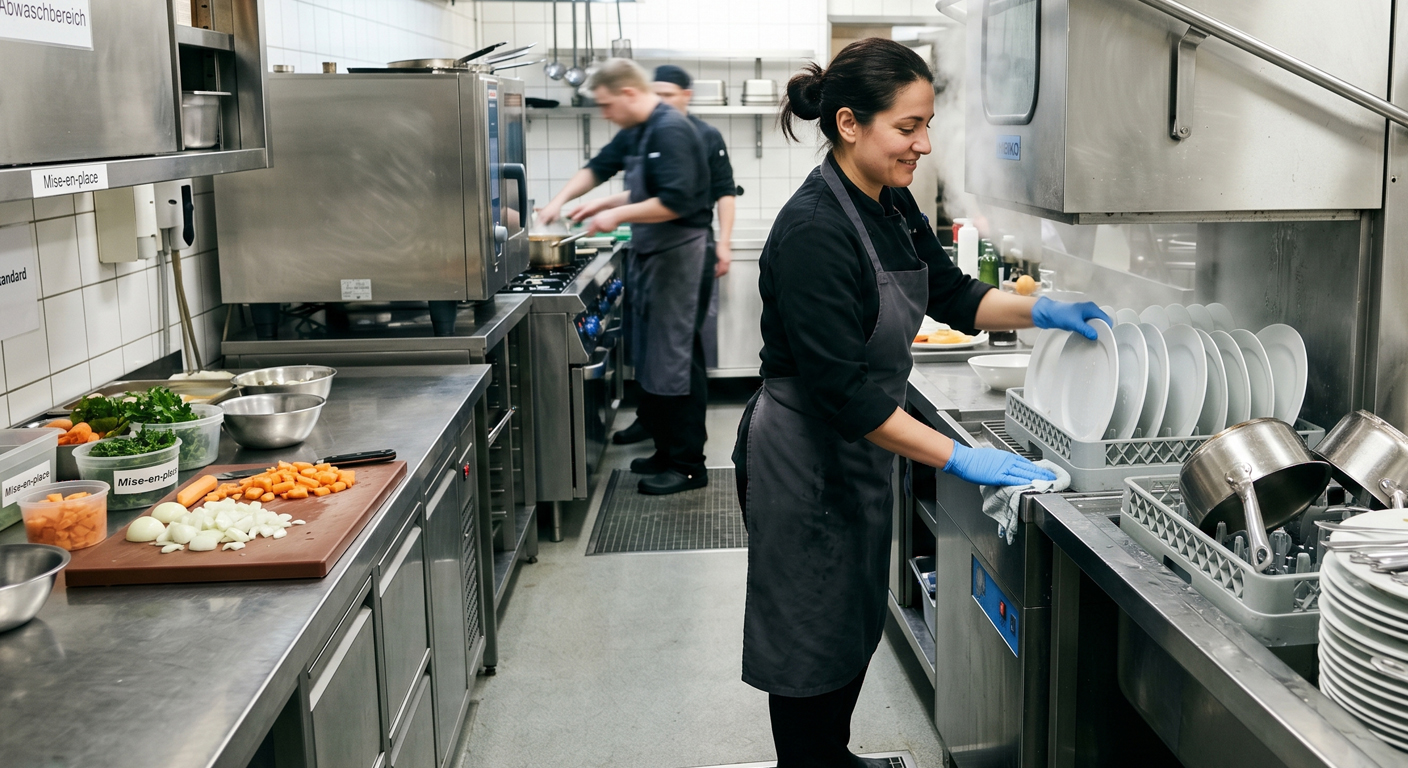 Spültätigkeiten: Fachgerechte Reinigung von Geschirr, Besteck und Küchenutensilien sowie Bedienung der Abwaschmaschine.
